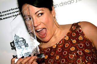 My first celebrity photo features Jennifer Tilly. The San Diego Film Fest event organizer people gathered the press around the screen thing (white backdrop with sponsor's names; there's a proper name for that thing but I can't think of it just now) and would make intermittent announcements to us: She's on her way! She's getting out of the car! While waiting, I asked a photographer and videographer standing next to me if they knew who she was, and they both shrugged. I later checked her out on IMdb and she's done quite a lot of movies, though the only one I've seen is Monsters Inc where she was the voice of Celia. This photo was taken after she won an award (best actress?) for her role in Intervention, I believe. It's hard to pay attention to details like movie names when I'm busy trying to get a good picture. Anyways, Jennifer was very sassy and made more creative poses than other actresses who merely looked adoringly out into the media crowd.