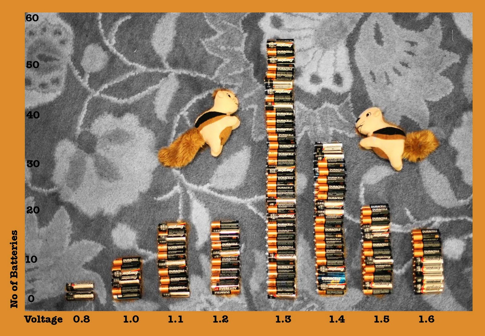 I do know that the batteries have juice left, so for the last over 2 years I've been accumulating post-flash batteries in the Batteries For Wii Remote drawer. My husband, on a sudden inspiration of geekiness, decided to use his voltage meter to see what voltage remained on all of the batteries. A full battery is 1.6 volts; a useless battery (the Wii remote complains at) 0.8 to 1.0 volts. He asked me to hypothesize the median voltage (that's the highest bar chart bar, for you non stat peeps) and I guessed a Normal Distribution (ie bell curve), making 1.3 the median, and Voila, the distribution is a slightly skewed Normal curve. (Please note; the batteries are double stacked; two layers).